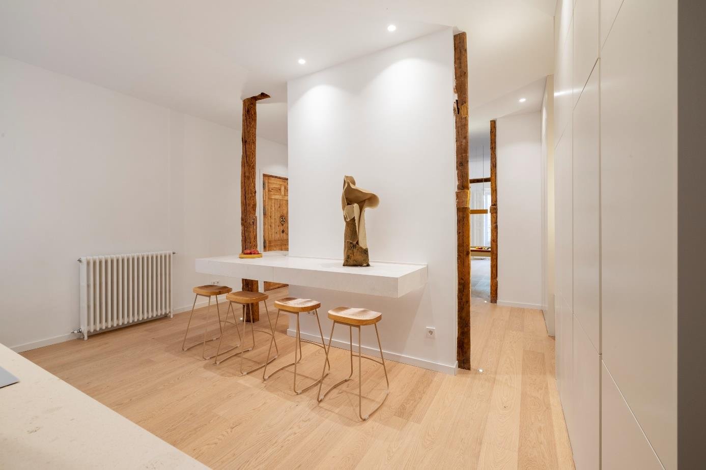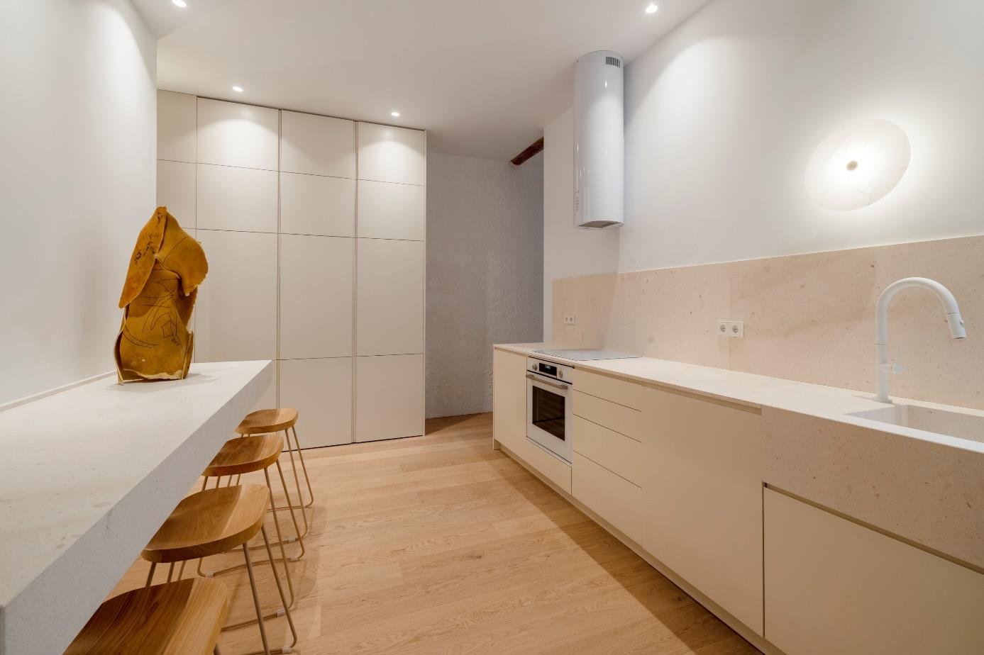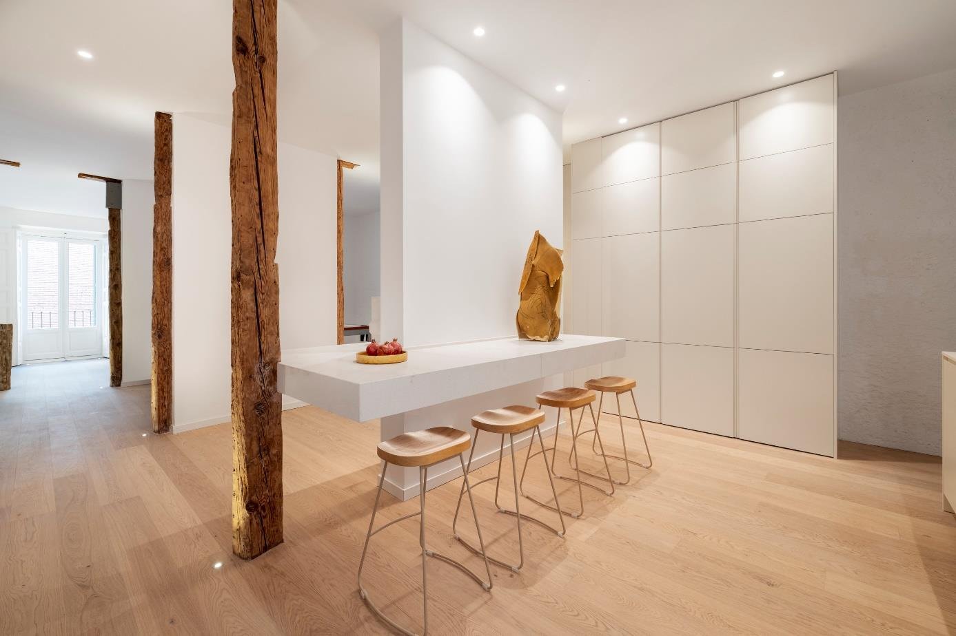 La vivienda es el resultado de un trabajo artístico, en el que se combinan espacios estéticos, armoniosos y funcionales. Es exterior y luminoso, con 3 balcones a la calle, techos de 3,15m de altura y estructura de madera vista original del edificio. Es un piso único, de autor. Se ha diseñado íntegramente a medida: la cocina, las pilas de piedra maciza, el billar que se transforma en mesa de comedor, los armarios, los muebles de los baños, las duchas italianas. Suelo de madera. Hasta el mínimo detalle está diseñado y construido de forma exclusiva. Parte de los muebles está hecha a medida con el material reciclado de la reforma del piso. Se ha prestado particular atención para elaborar un sistema de iluminación cálido, con detalles y de bajo consumo. Distribución: Gran openspace cocina abierta-comedor-salón, 4 dormitorios con 4 baños (3 en suite). Ascensor, aire acondicionado, calefacción individual por gas. Comunidad: 75€/mes, IBI: 1.300€/año